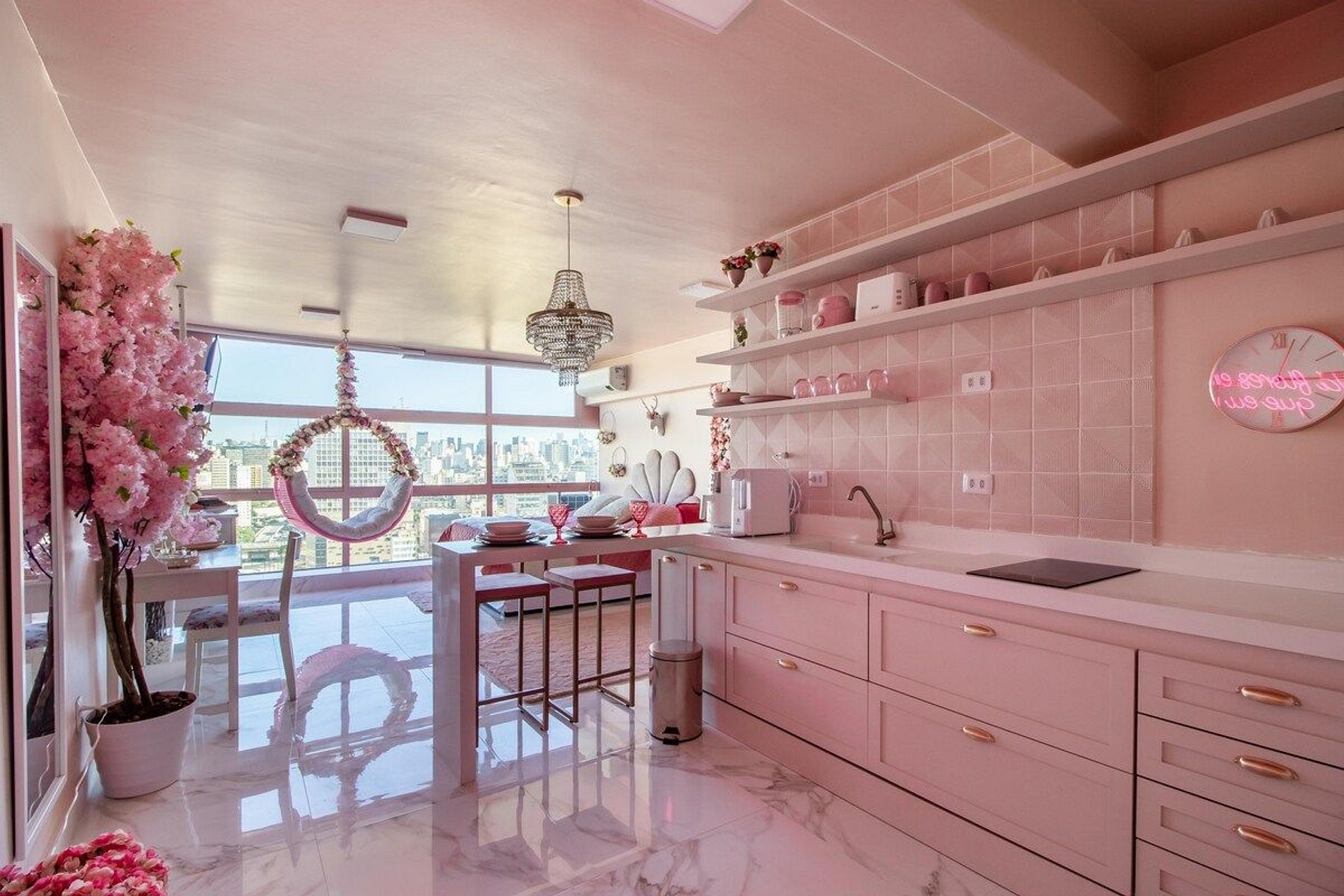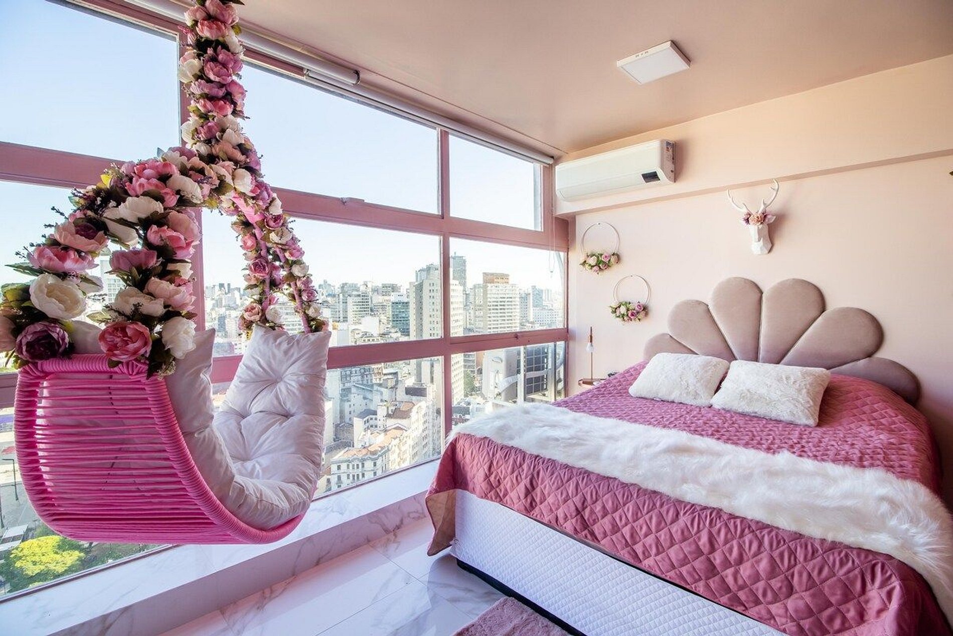 Sinta-se dentro de um sonho florido e cor de rosa! Esse lindo estúdio de 37 m² está localizado no 30º andar do edifício Mirante do Vale, com uma vista espetacular do Vale do Anhangabaú, no Centro Histórico de São Paulo e foi inteiramente reformado e mobiliado com decoração exclusiva feita à mão. **Sessões de fotos e vídeos (para fins pessoais) são bem vindas. Para fins comerciais, deve ser combinado previamente. *** Não fazemos locação por hora. Apenas diária.